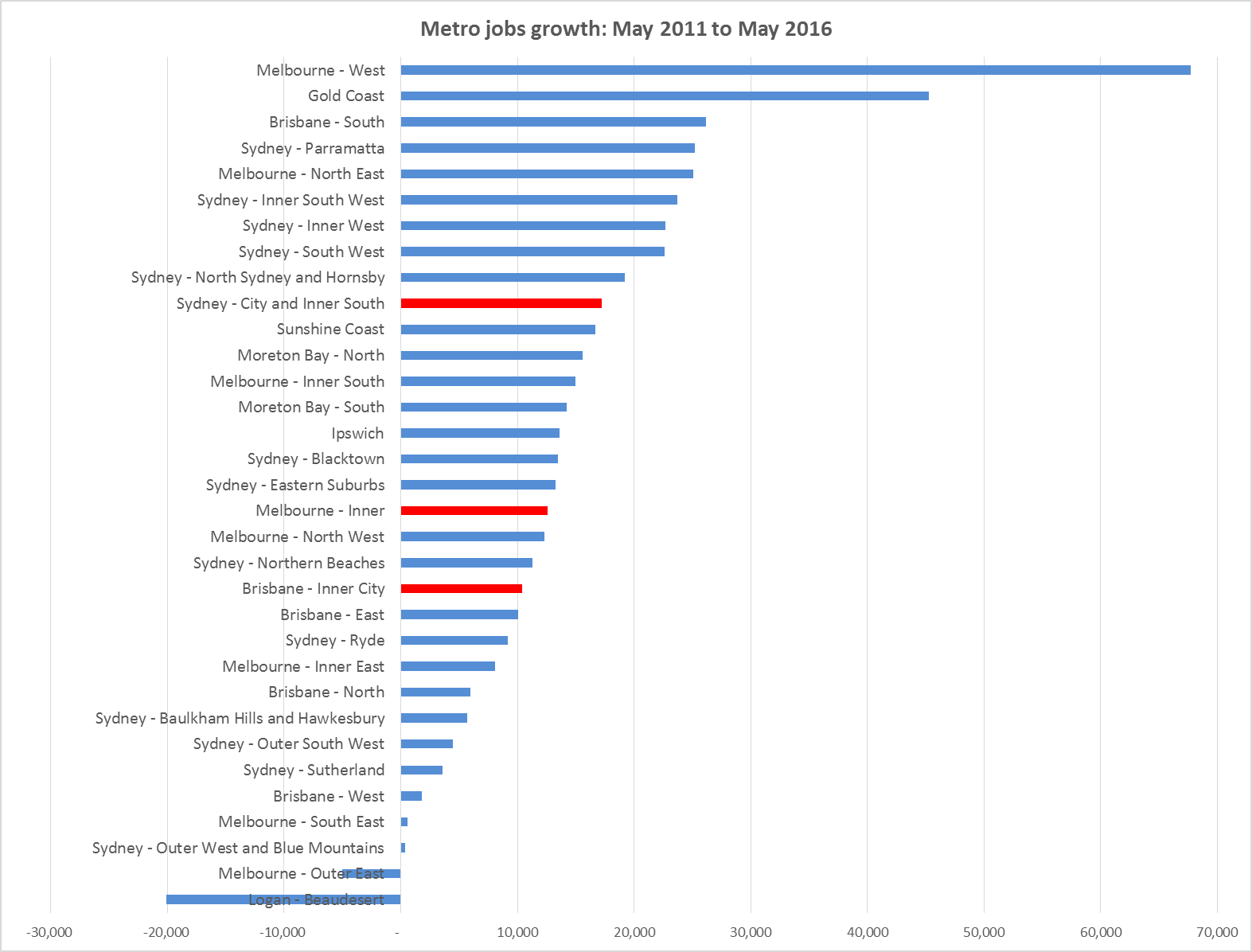 The latest labour force data from the Australian Bureau of Statistics paints the evidentiary picture. Taking in our three largest metropolitan areas, employment growth in the inner city areas over the last five years is not the dominant story some might have you believe.