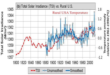 Looking further into the graph produced by the NASA press office (above), other NASA scientists revealed in a paper published in the journal Remote Sensing that the solar activity they displayed is not based on real satellite data but is a "model construction." Yet climate models have repeatedly been inaccurate and unable to properly model the climate. The authors instead introduced a well-respected record of solar variation over the past three hundred years and compared it to the rural temperature record. As seen in the graph below from Dr. Soon, with red indicating solar activity and blue temperature, the two lines follow very closely throughout the 1900s and early 2000s.