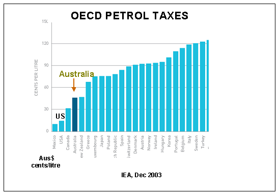 Most Australians are now aware that Australia has to import a significant proportion of our annual crude oil needs and that this costs about $12 billion. Motorists in city areas have been surprised by how quickly petrol prices have soared past $1 a litre to over $1.30 a litre and peak motoring organisations have called for the government to lower excise levels as a short-term fix. Data in the IEA figure below shows that Australia has one of the lowest levels of fuel excise in OECD. The position of motorists in Australia is nowhere as dire as those in countries where petrol has been subsidised. The STC web site carries recent stories from countries such as the Philippines, Indonesia, Nigeria and Iran where high oil costs have led to a fall petrol consumption, i.e. “demand destruction” as predicted by classical economic theory.