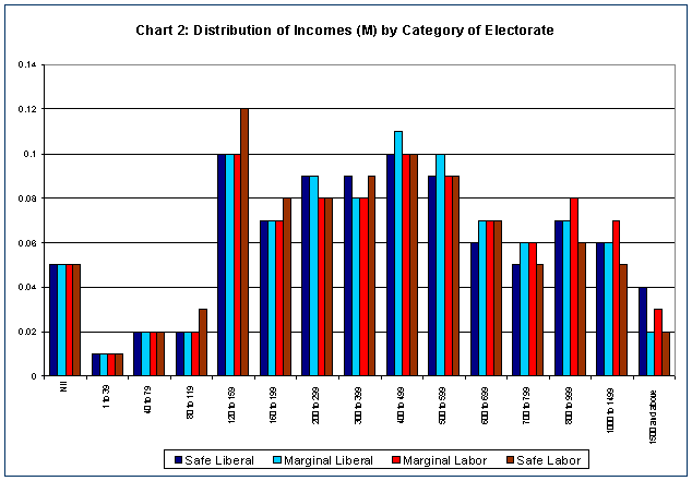 - welfare recipients and low-income earners were strongly concentrated in safe Labor seats (columns 4, 5 and 6 from the left), a category in which Labor performed quite well. This success was replicated in the $200 to $299 and $400 to $499 income groups, which were located disproportionately in key marginal Liberal seats; and