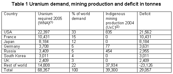 The promoters have conveniently ignored the fact as the UK has no uranium mines, one imported fuel will be substituted for another. Uranium will be in great demand if all the world’s plans for new stations mature. So how secure would supplies of uranium be and which country will be the most aggressive competitor for them? The current situation is shown in Table 1.