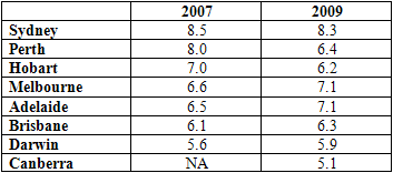 Overall, Queensland was mentioned no less than nine times in the 60 least affordable markets. Table 1 shows where each of the capital cities stood in 2007 (at the height of the “housing bubble”) and in 2009.