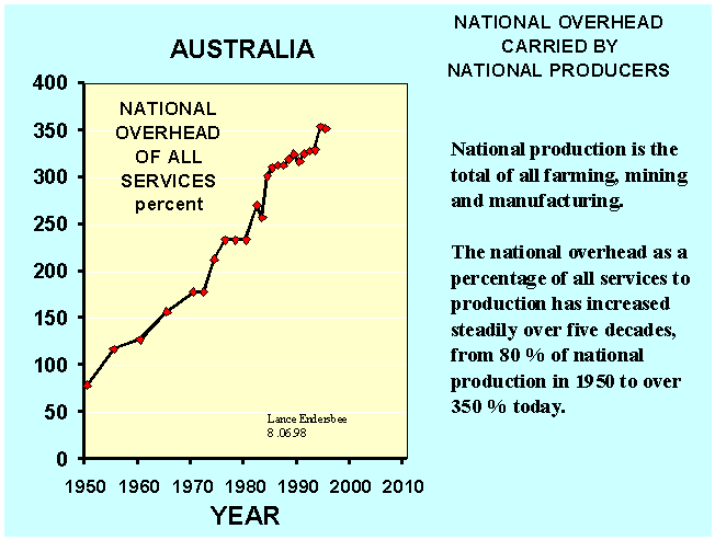 The growth in the services sector in the Australian economy relative to production has continued for fifty years. It has been exacerbated by the duplication of activities by national and all state governments, for example separate laws and regulations for a wide range of industrial, commercial and social affairs. The cost of such duplication finds its way into taxes, which are then a burden on every enterprise. The overall effect in Australia has been continued pressure on the production sectors of our national economy, a decline in infrastructure development, sale of public assets, an increase in services and various forms of social welfare, and increased national indebtedness. The cost of our imports consistently exceeds the value of our exports. As a result, Australia is living off savings - our own and that of other people.