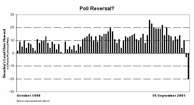 First, consider the most common way of picking an election winner – the polls. Every two weeks, the major polling firms ask about 700 Australians: "If a Federal election were held tomorrow, which party would you vote for?" This graph shows that since the 1998 election, Howard has trailed Beazley on the two-party preferred poll – with the gap widening to as much as 26 per cent. Yet in recent weeks, the Tampa incident and the American terrorist crisis has put Howard into the lead. Although he currently enjoys a healthy margin, it is hard to believe that these two incidents will continue to support the Coalition through to the election.