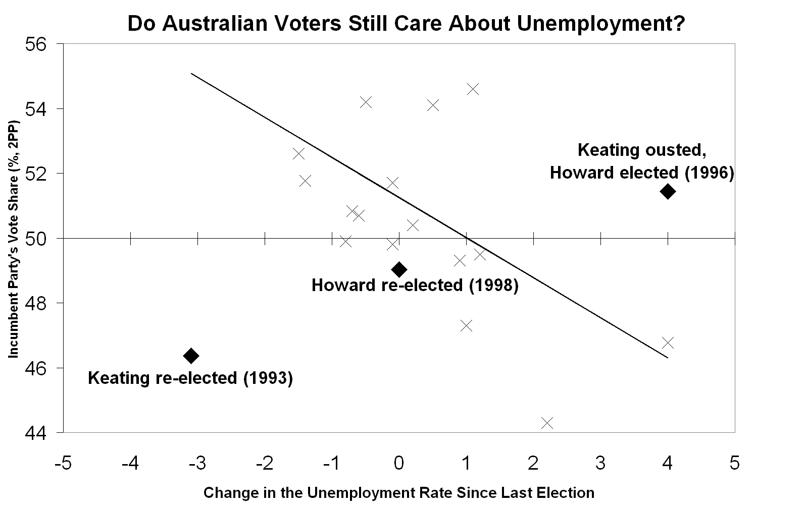 So if pollsters can get it wrong, why not turn to see what the economists have to say? The second theory of predicting elections starts from a simple maxim: historically, the people most likely to lose their jobs in a period of rising unemployment are the Prime Minister and Treasurer. Those who study the effect of economic cycles on elections explain this in two ways. On one hand, when voters learn that the government is not a particularly adept economic manager, they bring in new talent. On the other hand, perhaps the game is about retribution: when voters believe that economic opportunities have been squandered, they exact their revenge at the polls. Whichever theory holds, politicians have a strong incentive to manage the economy well.