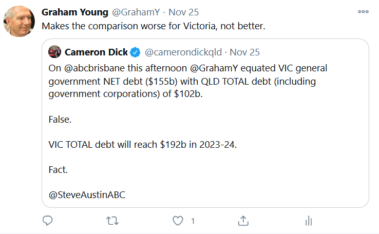 For some reason best known to himself, three hours later, on a parliamentary sitting day, Cameron Dick, State Treasurer, decided to tweet, calling me out for quoting net debt against gross debt. He pointed out the gross Victorian figure was $196 billion and quoted Queensland's as $102 billion.