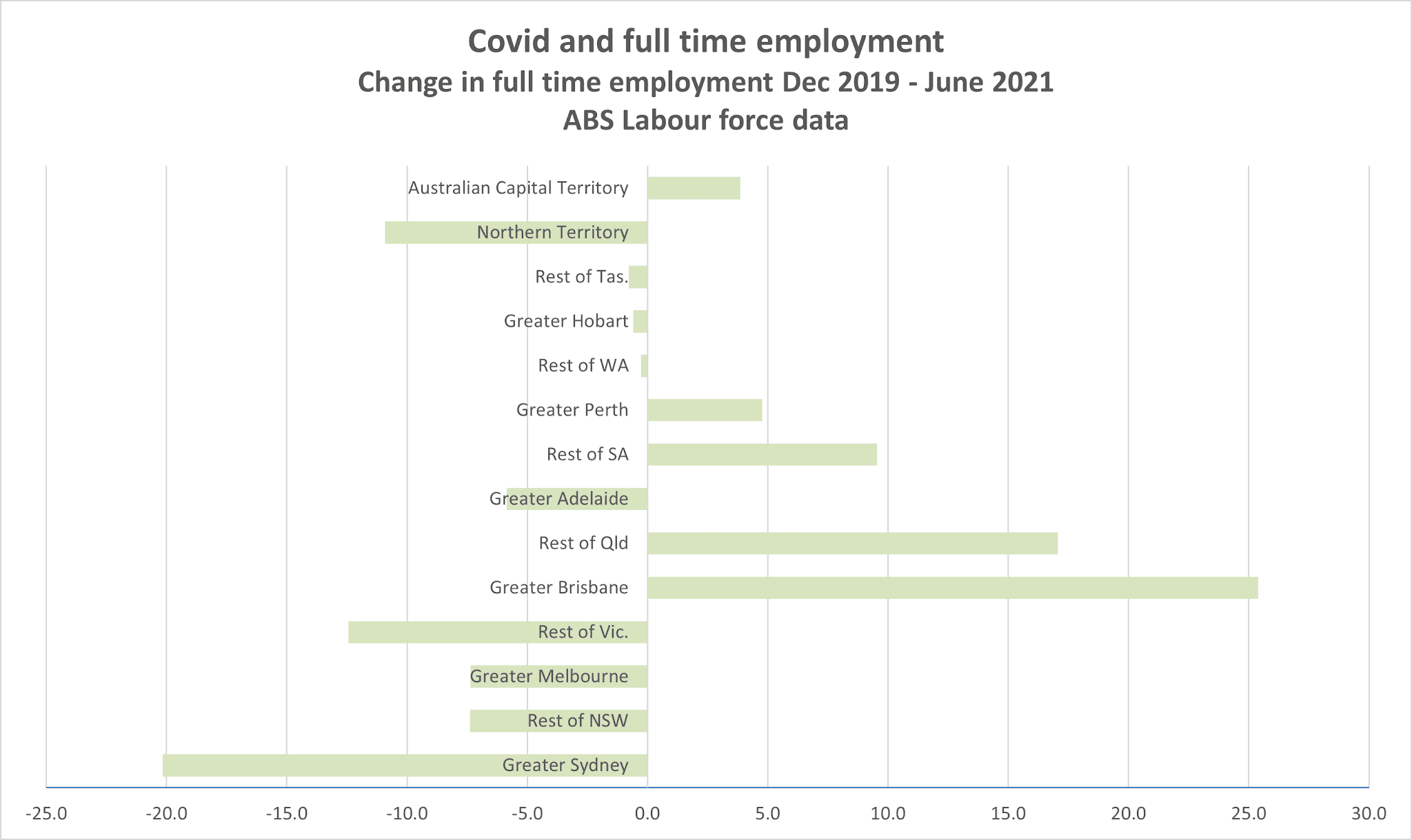 The impacts weren’t really felt in Australia until February – March 2020 when the first outbreaks (and lockdowns) began to appear in Australia. The greater Sydney story since then – roughly an 18 month period – has fared the worst, shedding 20,000 full time jobs. The higher they climb the faster they fall maybe? Also suffering a reduction in full time jobs were greater Melbourne, along with the balance of NSW, the balance of Victoria, greater Adelaide and the NT. (That impact in the NT, given its smaller overall size, would be more sorely felt, so keep that in mind for our NT cousins).