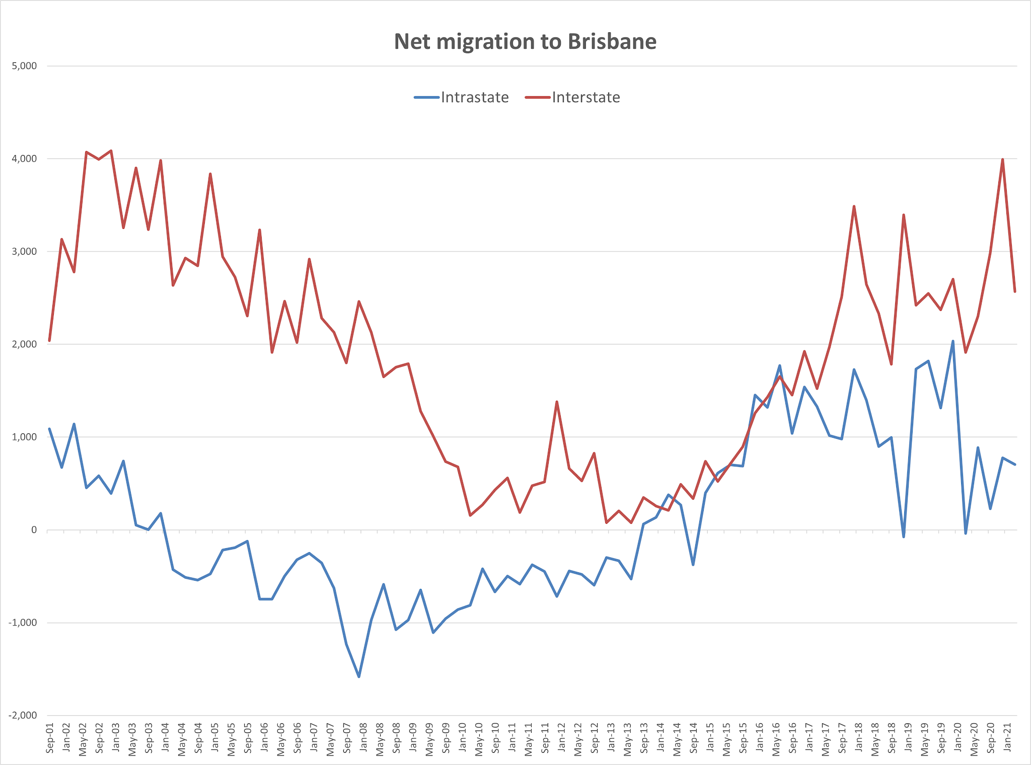 Lastly, the source of net migration to Brisbane is the combination of intrastate and interstate arrivals. Here you can see that for much of the last five years or so, net movements from within Queensland to Brisbane were contributing almost as much as movements from interstate to Brisbane. This wasn’t the case for the 2003 to 2013 period, where more people left Brisbane for elsewhere in Queensland than arrived. The curious thing about these numbers is the much-discussed city-for-regions exodus isn’t showing up yet. That might be revealed in later data but for the June 2021 quarter at least, more people arrived in Brisbane from elsewhere in Queensland, than left.