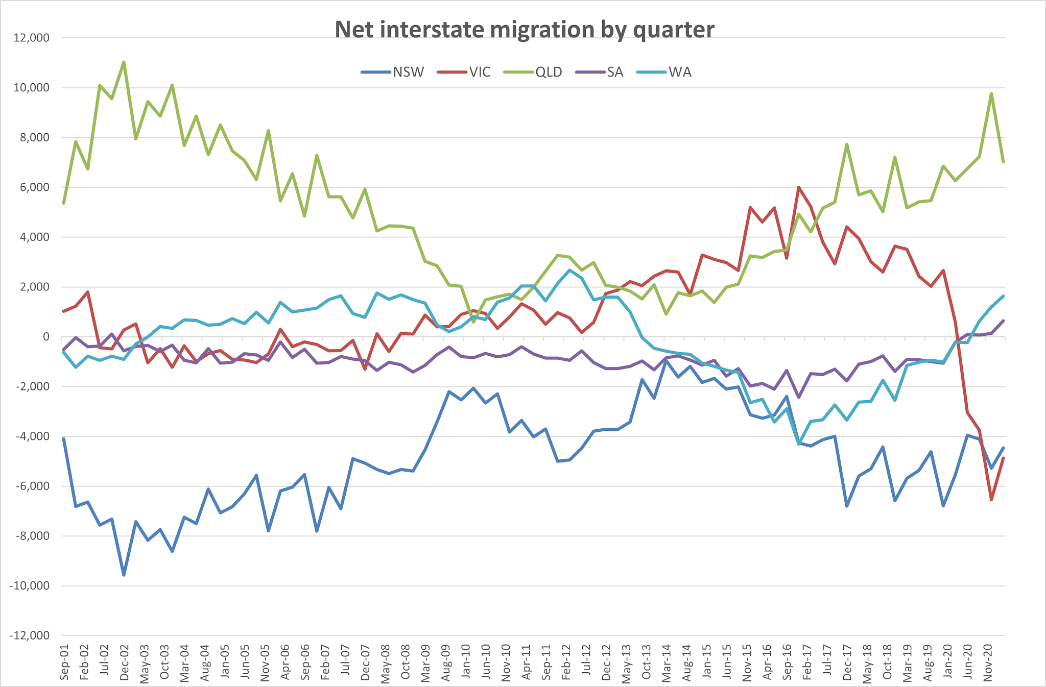 The next graph (above) charts net interstate migration by quarter for the last decade, showing the five larger states. Queensland has consistently seen larger net numbers, driven mostly by net departures in recent years from NSW but also from WA and South Australia. Victoria’s numbers crashed with Covid.