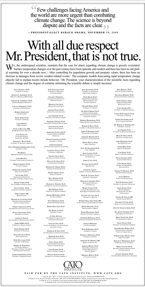 2009: Cato Institute newspaper ad campaign letter (right); 115 scientist signers. The letter focused on skepticism about the urgency of climate action and questioned the reliability of climate models and predictions. It was published as an open letter in major newspapers to influence public opinion and policy discussions on climate change.