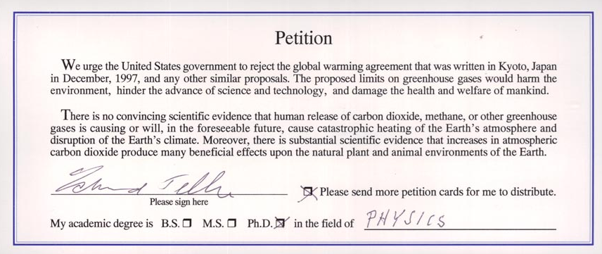 1997: Global Warming Petition Project - organized through the Oregon Institute of Science and Medicine, starting in 1997. That document now claims some 31,487 U.S. scientists and technically qualified signers, 9,029 with PhDs--see breakdown . Scientists, in this case physicist Dr. Edward Teller, signed the statement as follows:
