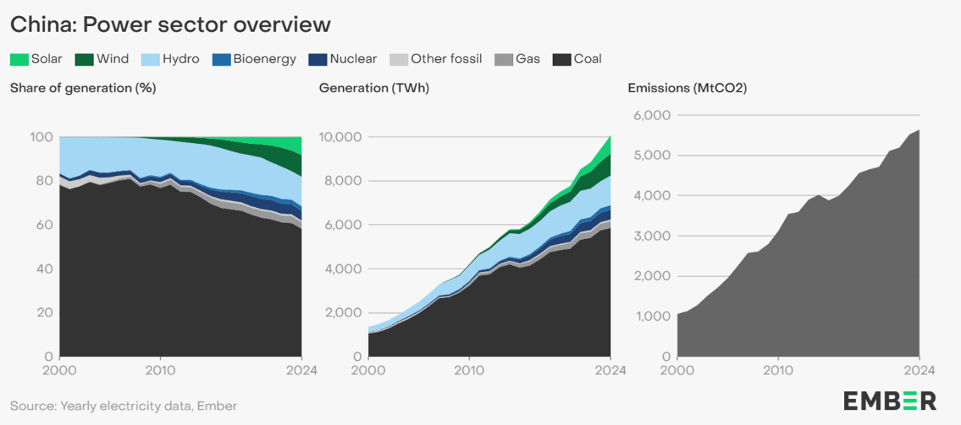 Although China has significantly expanded its solar and wind power capacity, the following graphs show that it is still heavily reliant on coal. This is why its greenhouse gas emissions have soared and now stand at double those of the US.