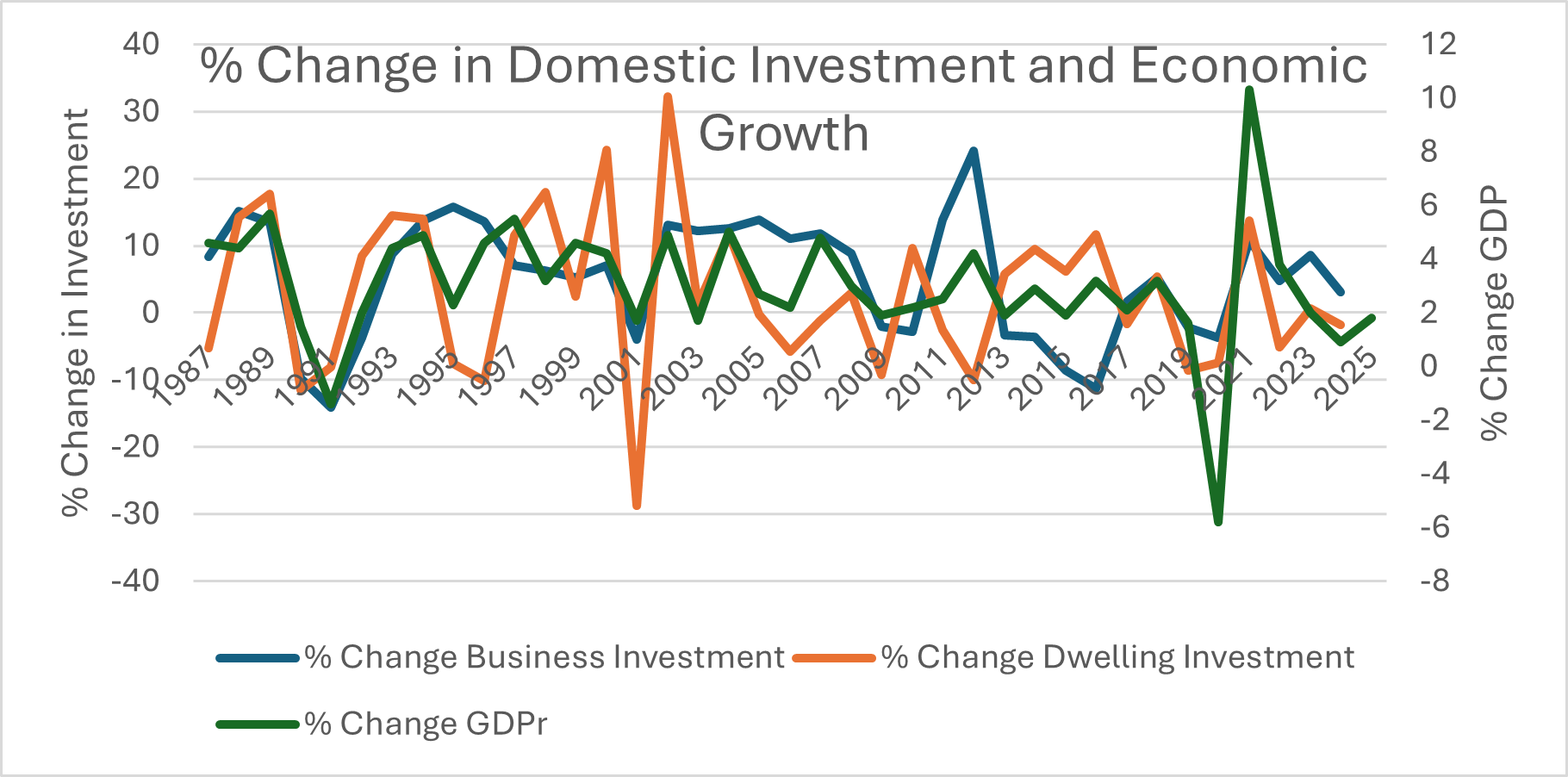 Post World War II, the level of investment drove economic growth for almost three decades. Chart 4 illustrates the importance of investment to Australian economic growth from 1987 to 2025 which encompasses structural reform. Business investment peaks at 15.8% of GDP in 1995; but, except for an extraordinary peak in 2012, business investment steadily declines.