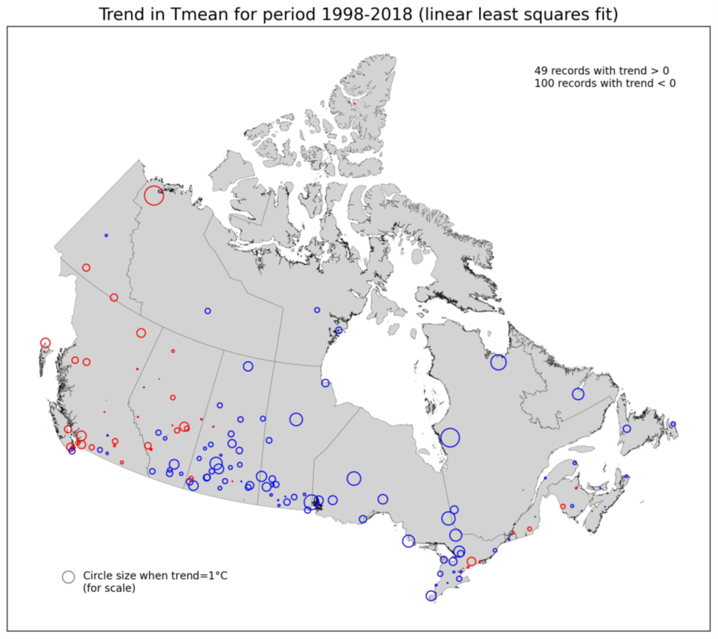 "Probably?" So, Canada is spending hundreds of billions of dollars largely based on data that the government scientist most involved in its generation can only say is "probably" indicative of real warming? Something she confirmed in part through "quickly checking the meta data." And, removing that questionable step change results in practically no real warming at all?Showing the map below in his report, where blue circles represent locations of cooling, and red warming, Hickey points out: "If anything, the two-decade trend in annual average temperature series for many AHCCD stations is negative post-1998."