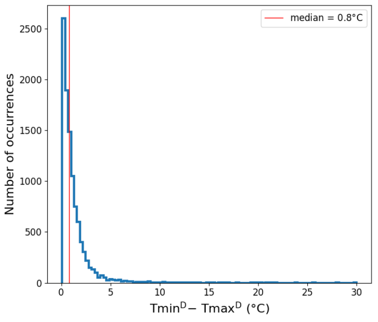 For the 10,159 instances, the median difference between Tmin° and Tmax° was 0.80°C (vertical red line in Figure 10), the average difference was 1.21°C, and the maximum difference, which was for Cape Dorset, Nunavut, on February 25, 1995, was 30°C." [my bold]