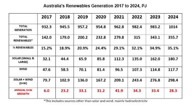 The table below gives Australia's relevant generation data for the last eight years (2025 data won't be available for another couple of months). Generation is expressed in one of the commonly used energy units in Australian statistics, petajoules. Some prefer the unit terawatt-hours; 1 PJ = 0.278 TWh. All true energy units are interchangeable. Personal preferences are irrelevant. What's important is the consistent use of energy in the analysis, not power.