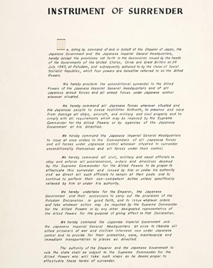 The following Instrument of Surrender – not a ceasefire – was signed by the Japanese on 2 September 1945 and could well constitute a template for Iran's surrender to the US now: