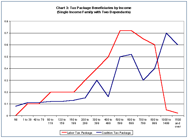 We thus turn to Chart 3. This chart shows the impact of the two major Parties’ respective tax packages across income groups. The impact of the packages was extrapolated on the basis of a single income, two child family.