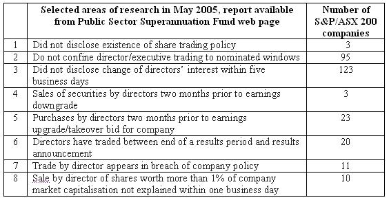 All the current rules and rituals of directors and officers trading shares could be eliminated. The current rules give false comfort and are expensive meaningless distractions. These rules provide the basis for the BT report as set out in the table below that was obtained from the website of the Public Sector Superannuation fund, a sponsor of the study.
