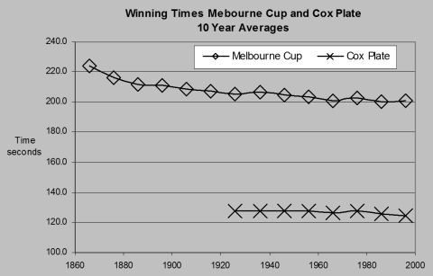 The comparison with human performance in competitive Olympic races is valid as these are races of the best athletes against each other and not the clock. It becomes more perplexing with the Stawell Gift, a classic handicap sprint. The winning times over 100 years are near constant while Olympic athletes have clearly improved their performance. This is significantly different to the horses’ performance in the Melbourne Cup and the Cox Plate.