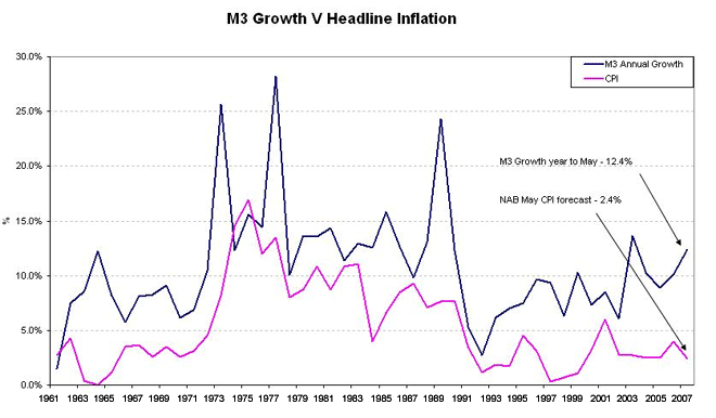 The graph shows the generally positive correlation between inflation and monetary growth. The correlation has been complicated by financial deregulation and involves fierce debate about causation - is money the horse or the cart?
