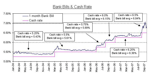 The graph shows the official cash rate while the slightly higher line shows an average market-based bill rate. The gap is a measure of stress in cash markets. The normal gap is 10 to 15 points, but this blew out to more than 50 basis points during the crisis. Note the subsequent fall back, not all the way but signalling a clear relaxation of market stress.