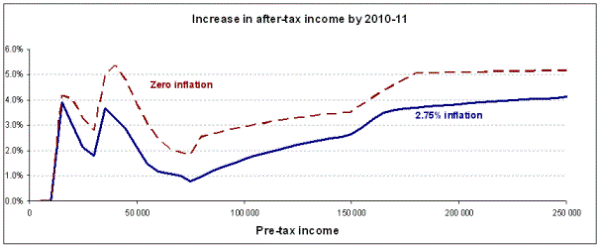 The big winners are those with very high incomes (above $200,000) who will enjoy rises of 5 per cent without inflation and still a generous 4 per cent with 2.75per cent inflation. The effects are shown in a graph below, and a full model is in an interactive spreadsheet (Excel format) into which the reader may insert his or her own inflation estimates (and simulate the effect of incomes remaining at present levels without inflation compensation).