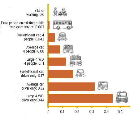 The Federal Government’s Australian Greenhouse Office (AGO) enumerates the kilograms of greenhouse gasses emitted per person per kilometre travelled using an array of transportation modes.