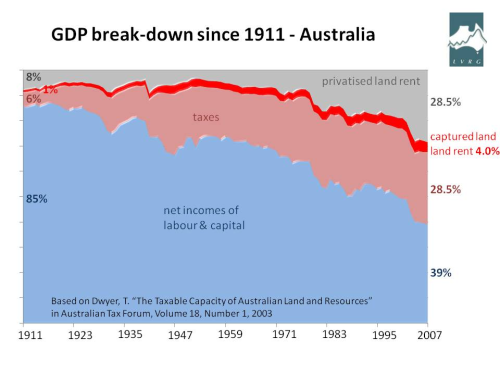 Since 1911, Australian after-tax incomes of labour and capital have declined relentlessly towards vanishing point, from 85 per cent of GDP to only 39 per cent, as tax revenues have grown to occupy 32.5 per cent of the economy. Coincidentally, land rent has also grown to 32.5 per cent of GDP. As we capture only 4 per cent of GDP through rates, land taxes and other taxes on immovable property, this means that privatised land rent now represents an enormous 28.5 per cent of our GDP! We’ve developed an unsustainable economy of “the free ride”.